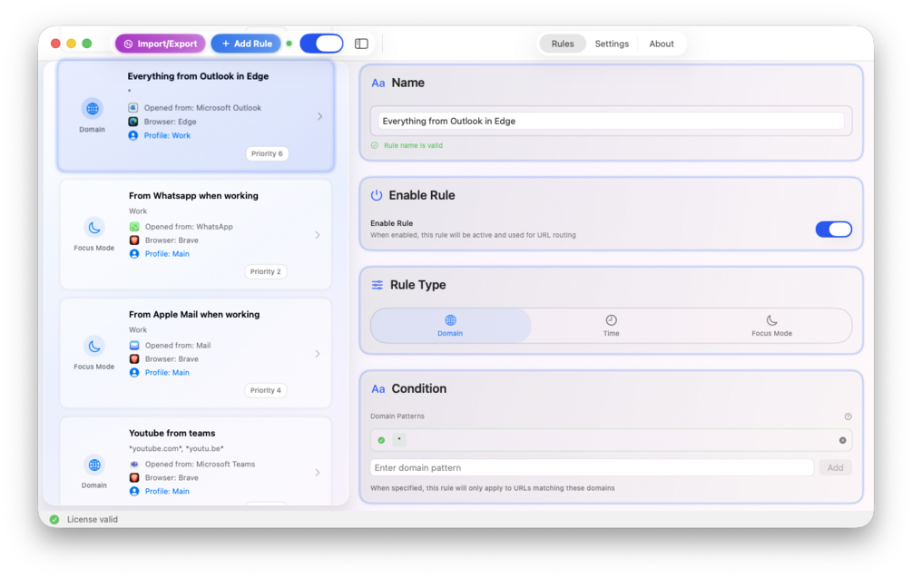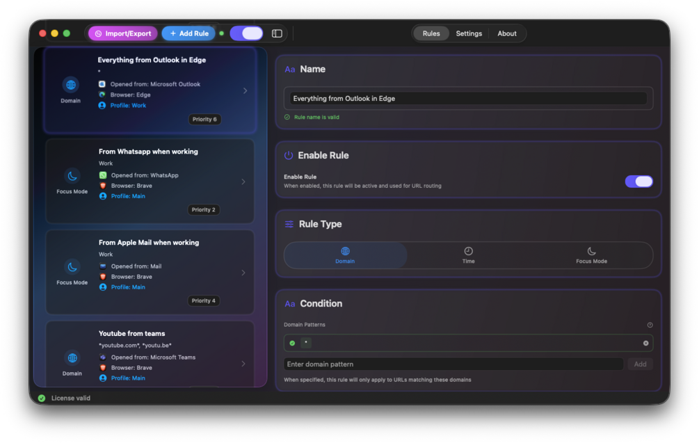 - App-aware routing - set up your rules to only apply on links opened from a certain application